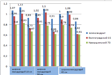 Анализ полученных данных по высеву сафлора при различных способах посева показывает, что при междурядьях шириной 15 см и норме высева 350 тыс. шт был получен наибольший урожай у сорта «Александрит»– 1,13 т/га. При этом же способе посева и норме высева 450 тыс. шт. у сорта «Камышинский 73» был зафиксирован самый низкий урожай семян – 0,67 т/га.