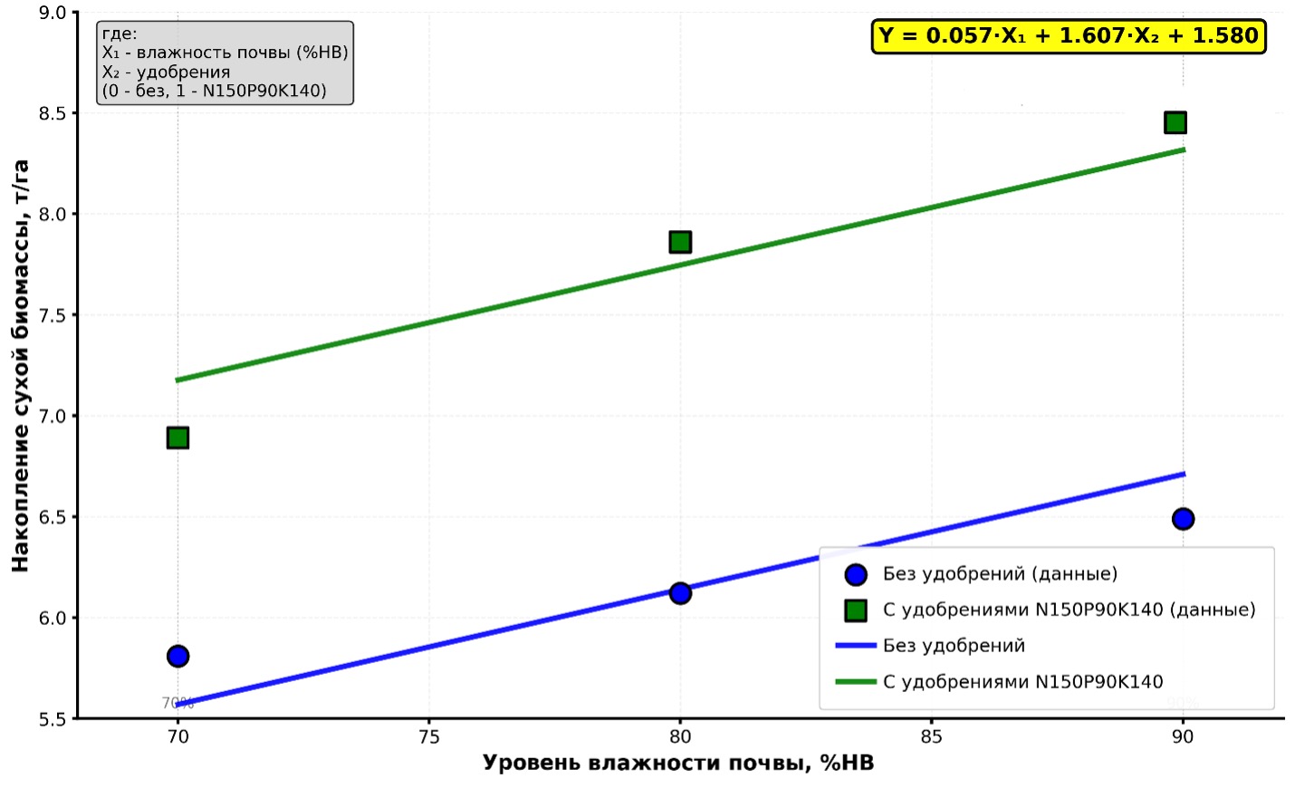 X2 – фактор минерального питания (0 - без удобрений, 1 – внесение N₁₅₀P₉₀K₁₄₀);